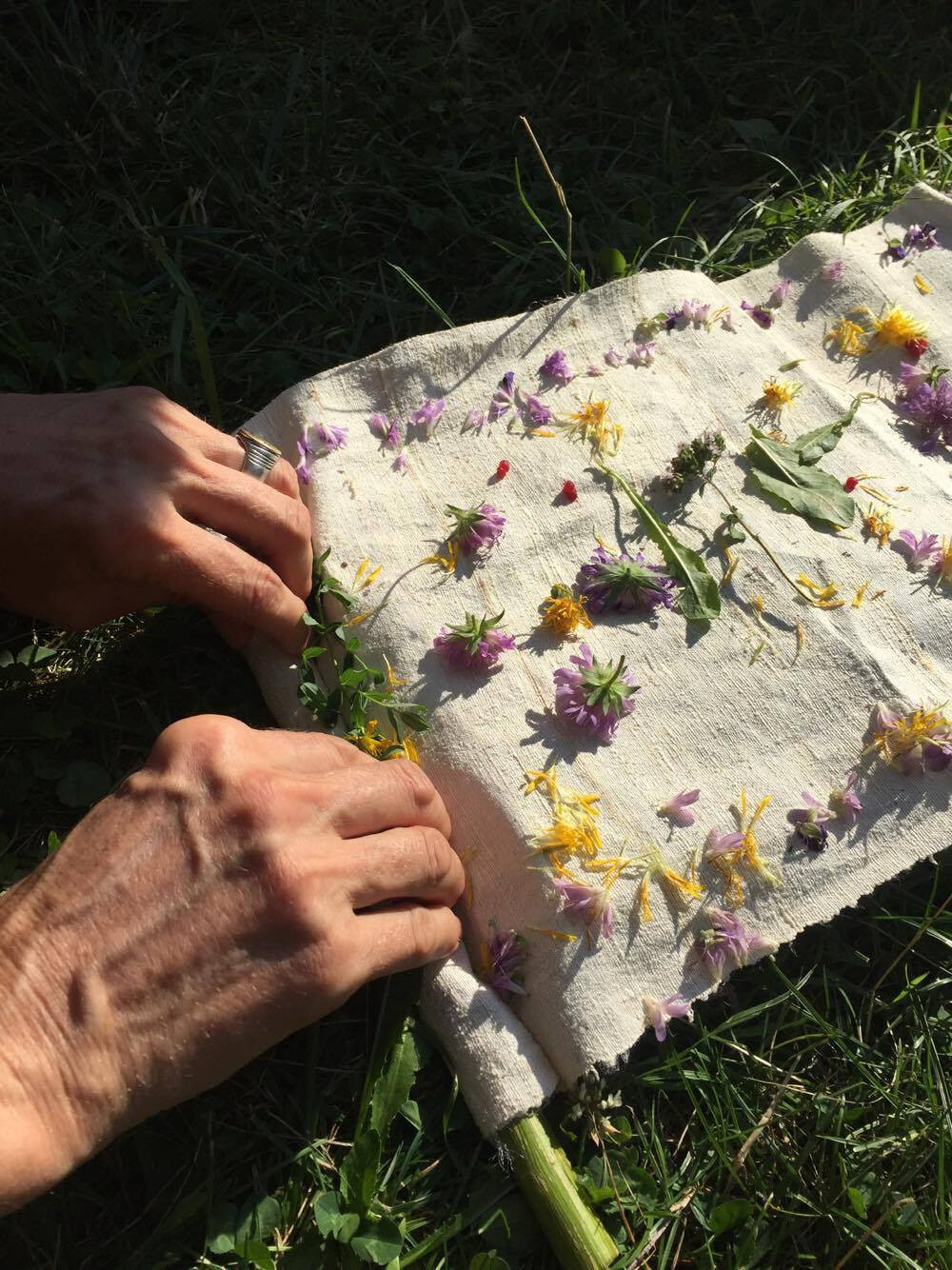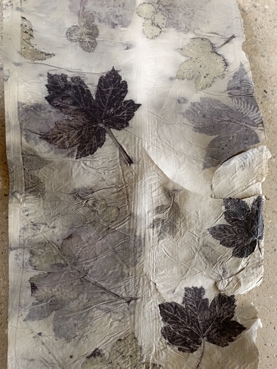 During waiting time (dyeing in the dirty pot, developing photos in the sun, etc.) we experiment with other techniques, such as Cyanotype, Hapa Zome, and Flower Bundle Dye.